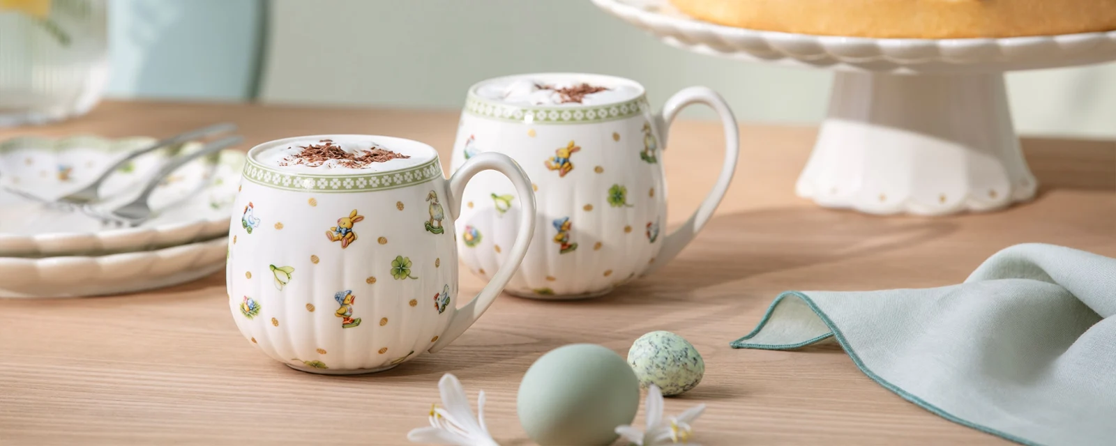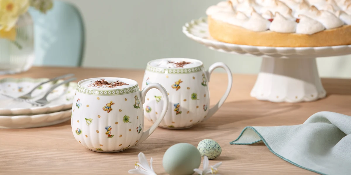 An Easter breakfast includes flavoured tea and freshly brewed coffee for the adults, milk and cocoa for the children, and juices and mineral water for everyone. A glass of Prosecco or sparkling wine is the perfect prelude to a big feast. You’ll find matching cups, mugs, and glasses for every beverage in the Villeroy & Boch online shop.